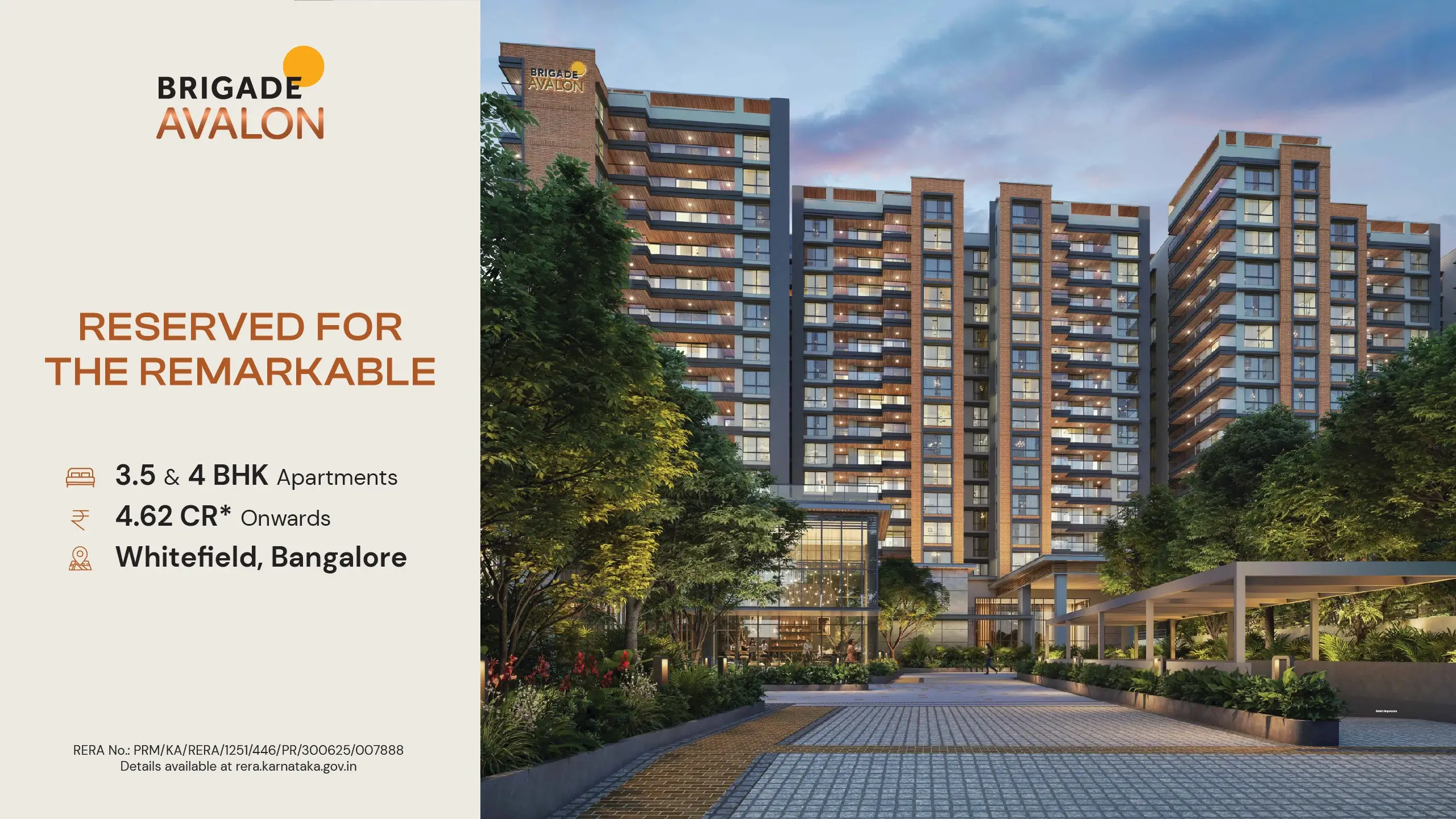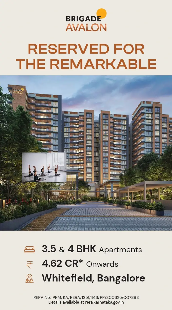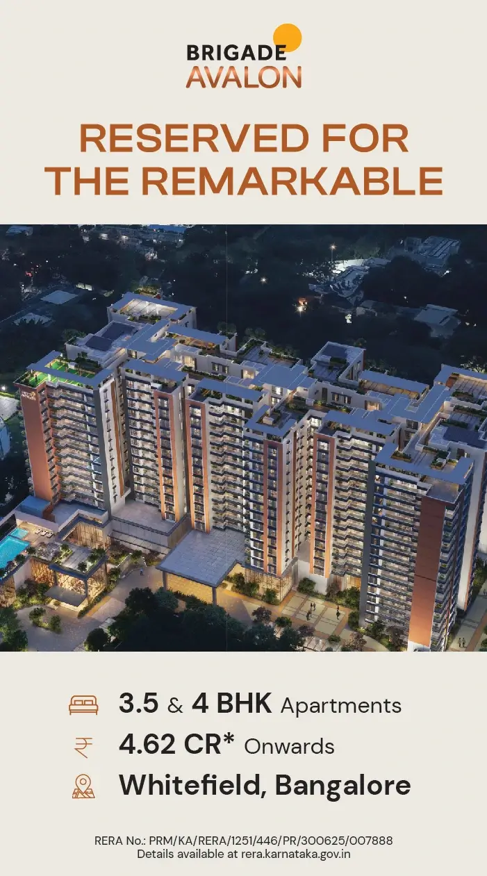 Brigade Avalon, located in the heart of Whitefield, is where luxury meets comfort. This is the place in Bangalore where you will get all the access easily. This is a property spread across 4 acres and 14 guntas with 80% open spaces and lush green gardens. Brigade Avalon is a high-rise residential project by Brigade Group. This property has 206 homes with 3.5 and 4 BHK types. Features a 25,000 sq ft clubhouse with more than 40 lifestyle amenities, and also has a strong focus towards connectivity. Brigade Avalon makes your every morning cheerful with morning sunlight, and you can enjoy every day in the clubhouse, and the evenings are perfect from your balcony. Enjoy your kids' evening playtime in the garden with the fresh natural air and a happy sunset ending. When you choose trust, Brigade brings more with the new. Enjoy the elevated living experiences in Bangalore’s most vibrant IT hub area.